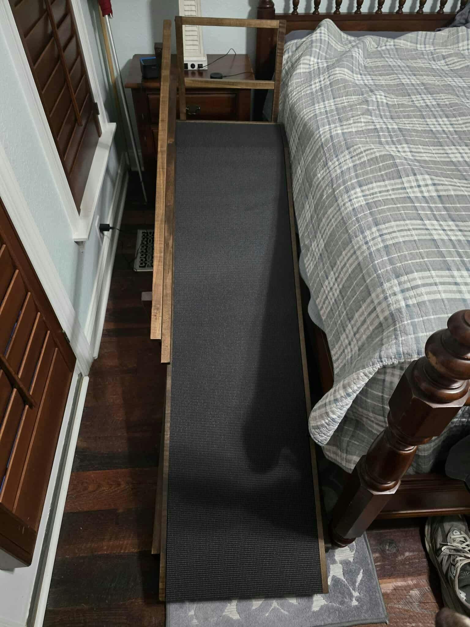 We got this ramp for our 2 year old 75 lb girl who sadly was born with all kinds of joint dysplasia. She’s just recovered from her second joint surgery and has arthritis, so we wanted to get her something to make it easier for her to get into bed on her own. We had dog stairs before, but they were way too steep and narrow. The ramp is beautifully crafted, sturdy, and so easy to set up! It’s an investment, but I expect it to last her lifetime. It only took her a few minutes to get used to, and she uses it every time now. The pic is her first try haha