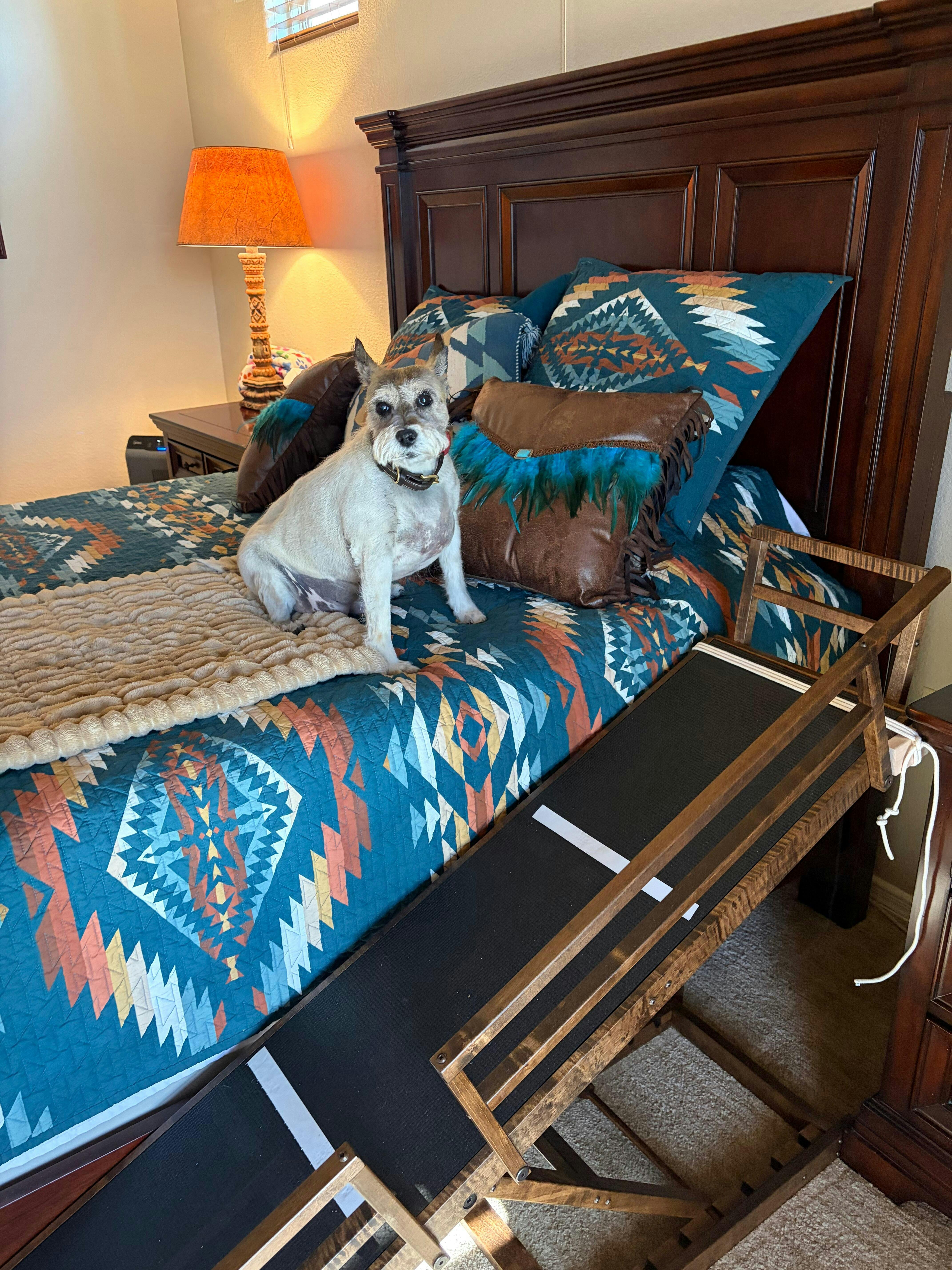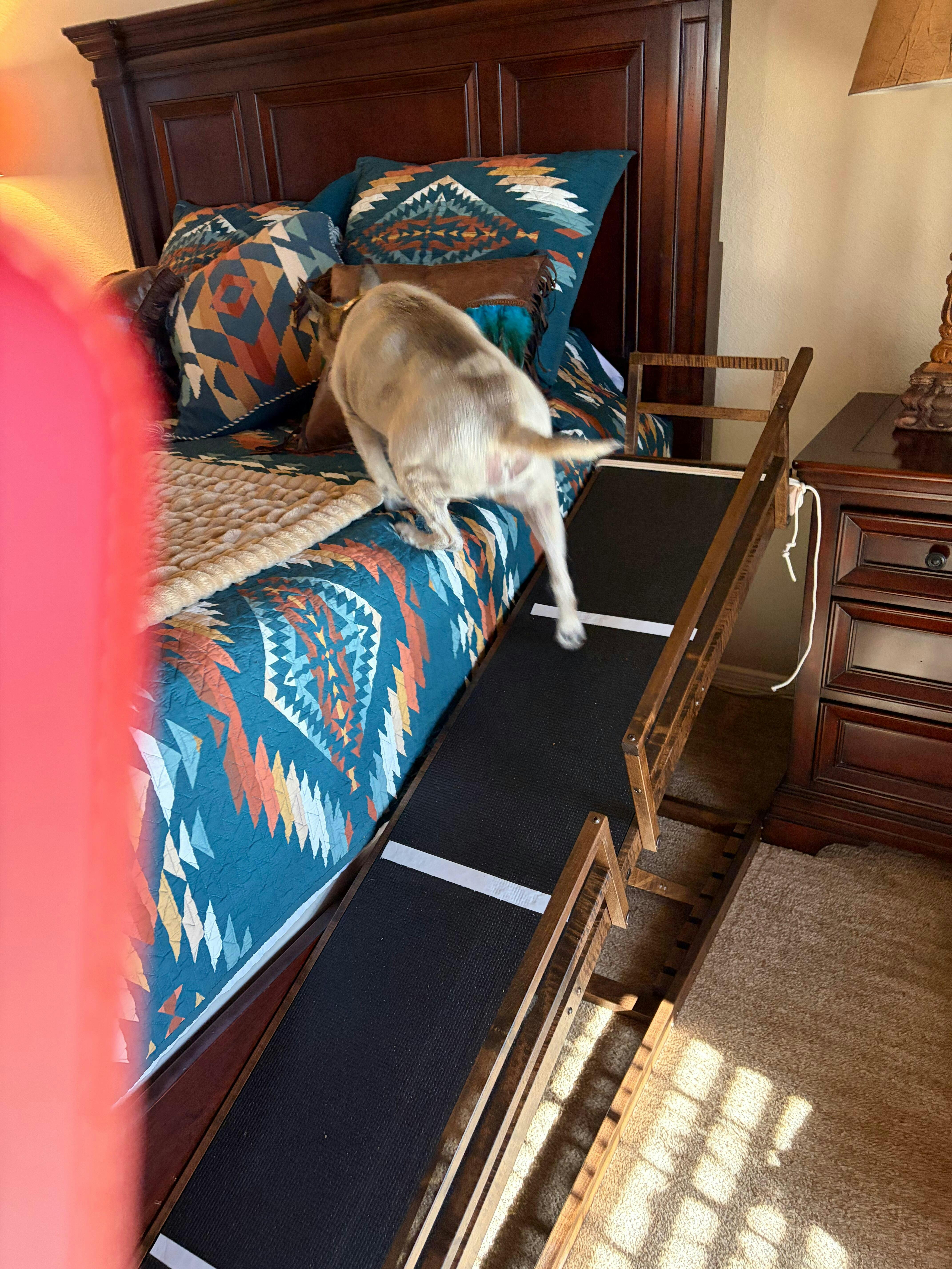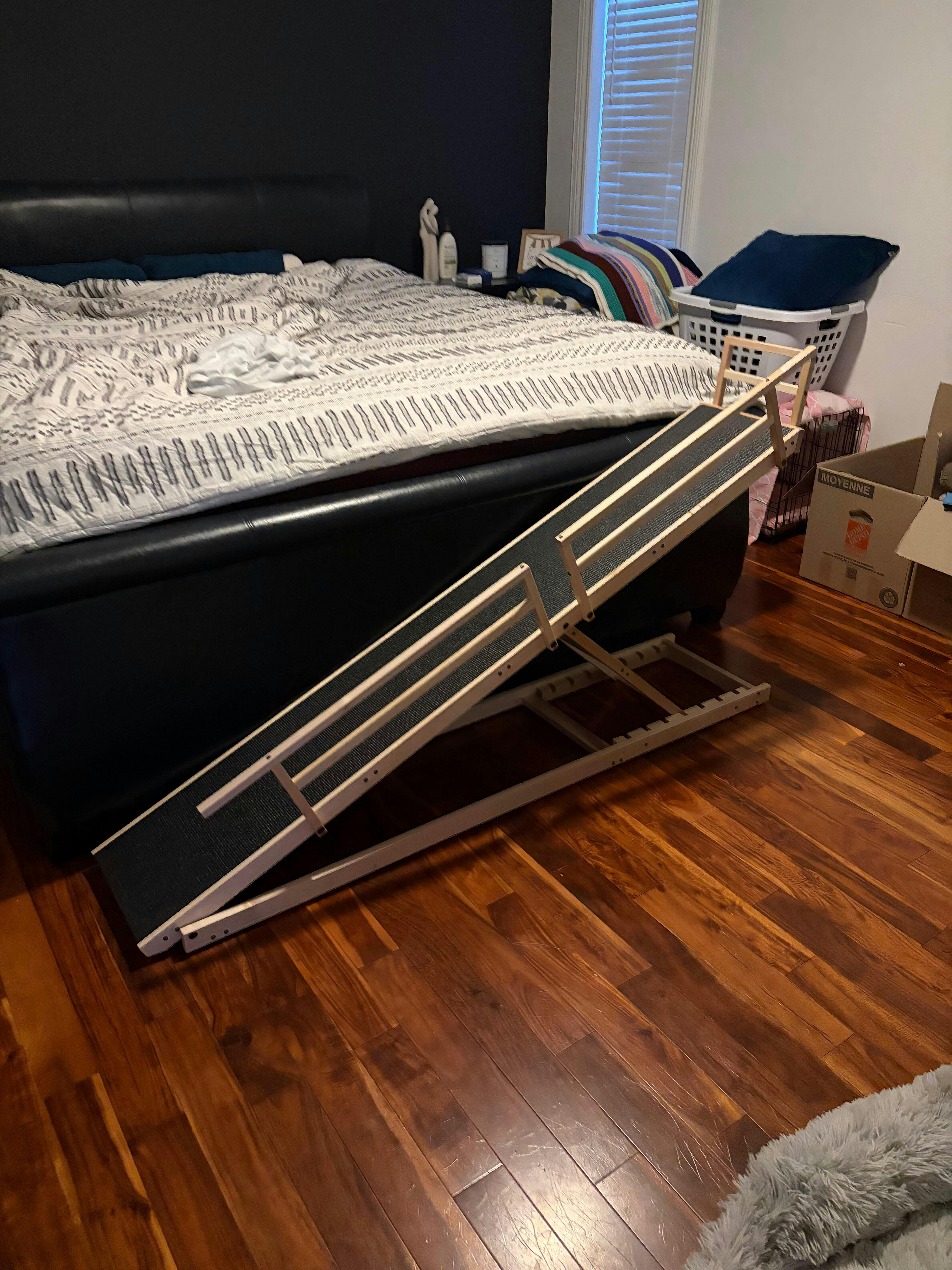 I needed a bed ramp for my 26lb. Pup that would reach my 39” tall bed……FOUND IT! Attractive design, well built with a skid-proof ramp cover and adjustable heights. Solved my problem quickly! Learning to go up was simple using a “trail” of treats. Going down was a bit more daunting but in less than a week….no issues. My back thanks you!!!