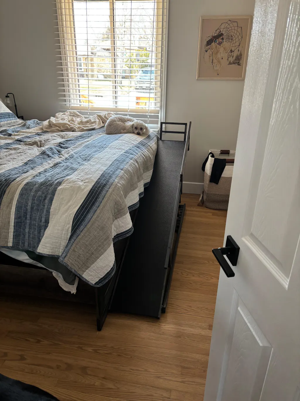 This ramp is ideal for small dogs up to 50 lbs, especially dogs that shouldn’t be jumping on and off furniture, such as dogs prone to IVDD like dachshunds and Frenchies, as well as other small dogs, or dogs that are senior, have arthritis, joint issues, or recovering from surgery, as well as puppies who need safer bed access while growing. If you have a heavier dog, we recommend our Large Dog Ramp for Beds, which is built for added width, weight, and stability.