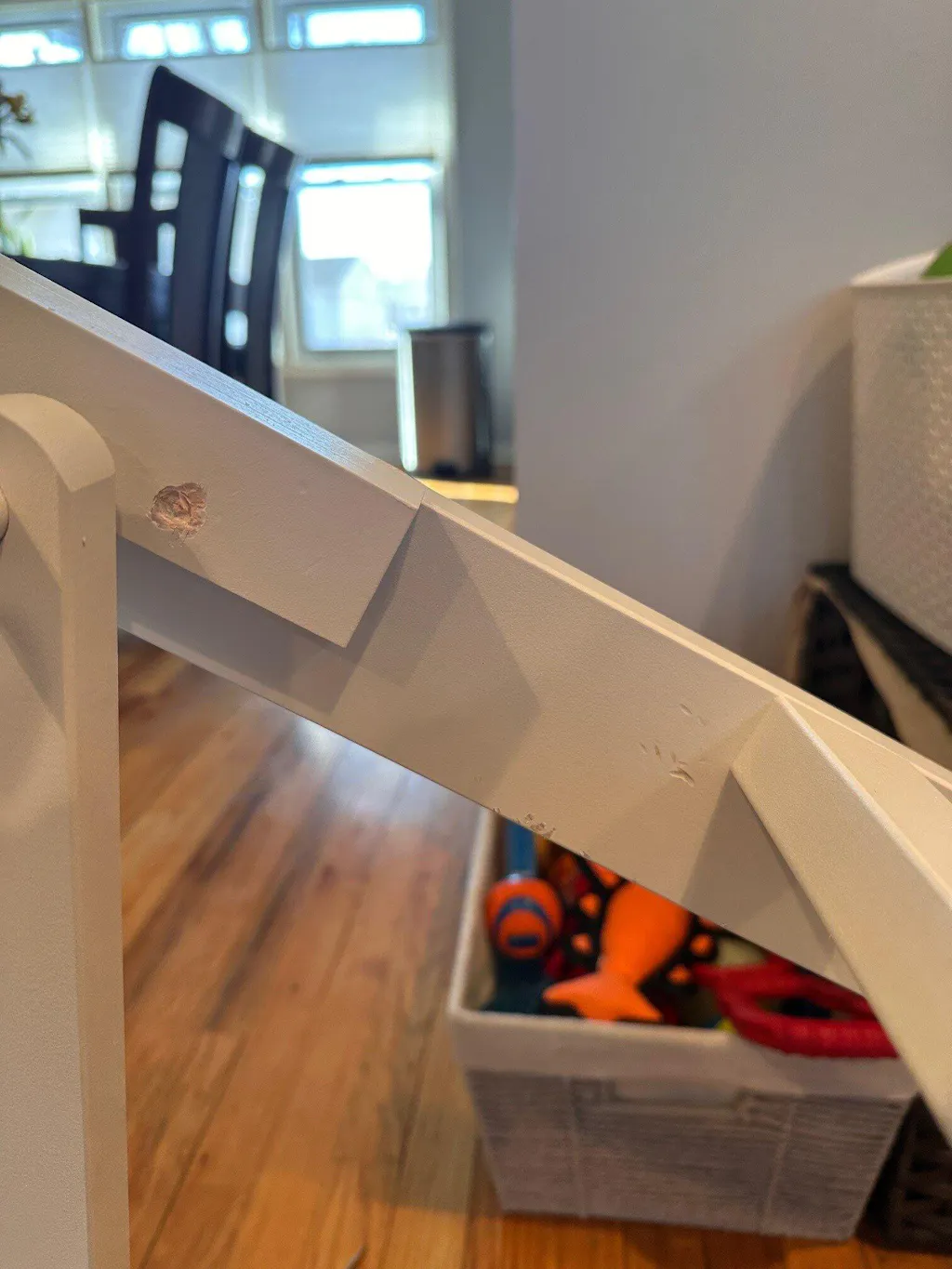 The first time we received the ramp, it was missing screws, wingnuts, and some of the screws were stripped. I did not feel confident having our heavier dog use the ramp with missing pieces. I reached out to customer service and they were quick to respond and offered to send a replacement once I ship the original ramp back. The original color we had was on backorder, but I was open to getting any color that was readily available because our dog had recently torn his CCL. Unfortunately, the replacement ramp arrived with several chips in the wood and dents the size of a dime. Customer service was once again quick to respond, offering another replacement ramp, but I did not want to have to deal with lugging this massive ramp to UPS again and we did not want to wait several days/over a week for a new ramp which may or may not be damaged again. The chips did not impact the functionality of the ramp, but since it's painted wood I'm sure the chips will get worse and flake with time. I declined the new ramp and was given $50 back...